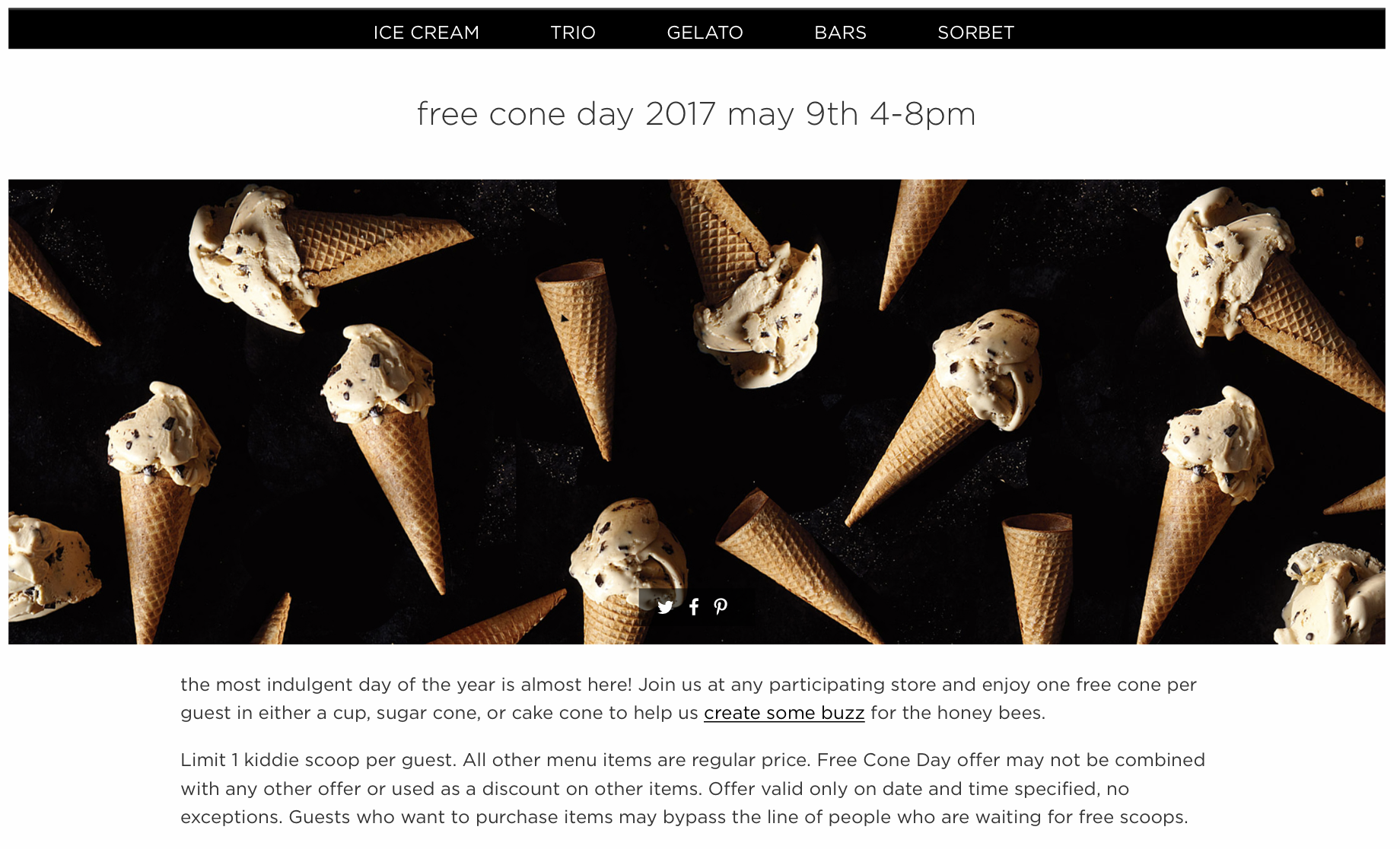 The most indulgent day of the year is almost here! Join us at any participating store and enjoy one free cone per guest in either a cup, sugar cone, or cake cone to help us create some buzz for the honey bees. Limit 1 kiddie scoop per guest. All other menu items are regular price. Free Cone Day offer may not be combined with any other offer or used as a discount on other items. Offer valid only on date and time specified, no exceptions. Guests who want to purchase items may bypass the line of people who are waiting for free scoops.