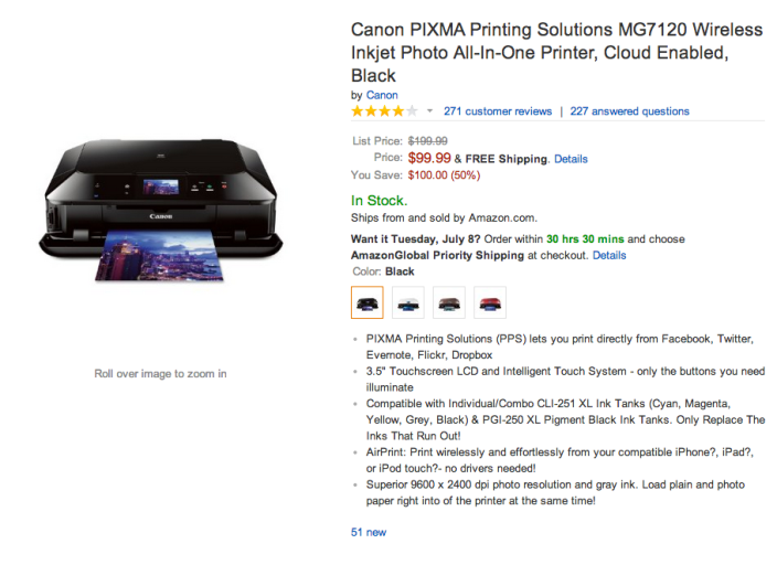 The Canon PIXMA Printing Solutions Wireless Inkjet All-In-One Printer (MG7120) has received a 4/5 star rating from over 270 customers. Today’s deal is not to be confused with the MG5520 model, which has a smaller display, less functionality and a lower photo printing resolution.