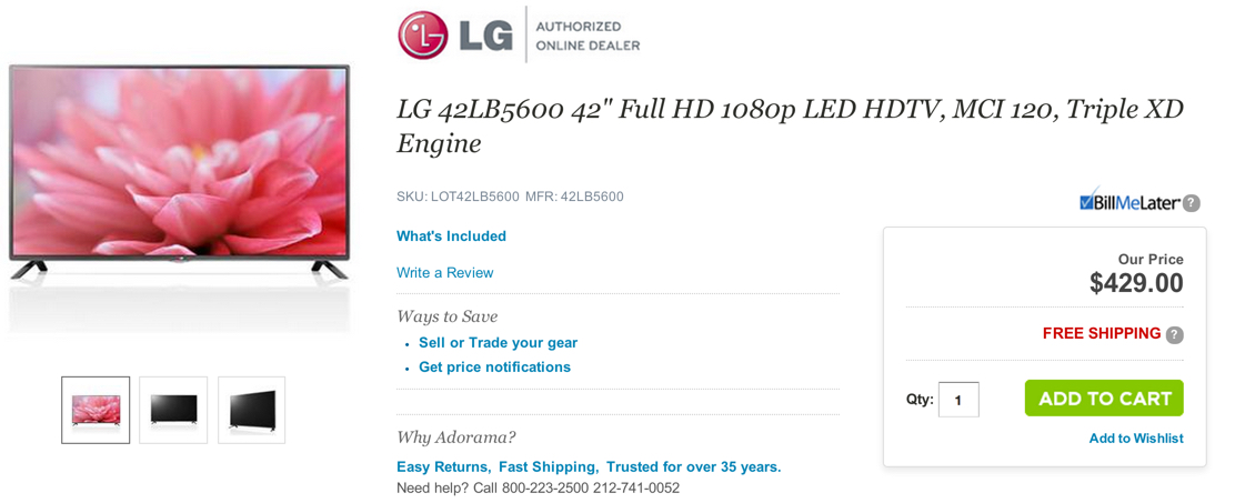 The next one we found at Adorama. It’s the 42″ LG 1080p 60Hz LED HDTV for $429. The coupon code S083190810 cuts it down to only $319 with free shipping. That’s a savings of $110 off the list price and the best offer we could find for it.