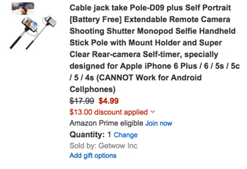 Getwow Inc. via Amazon is offering the Cable Jack Take extendable selfie stick for $17.99. But, when you use the coupon code: 2EQKJVTP at checkout the price drops to only $4.99 Prime shipped. That’s $13 off the regular price and the lowest we’ve seen for it.