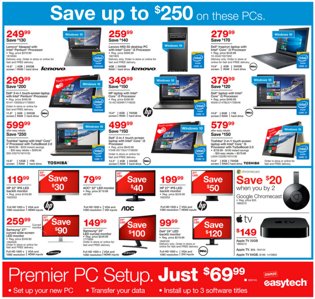 Standout deals include up to 25% off Apple iPad Air 2 and iPad mini 4. Staples is also discounting Kindle tablets, new second generation Chromecast and the 4K Fire TV.