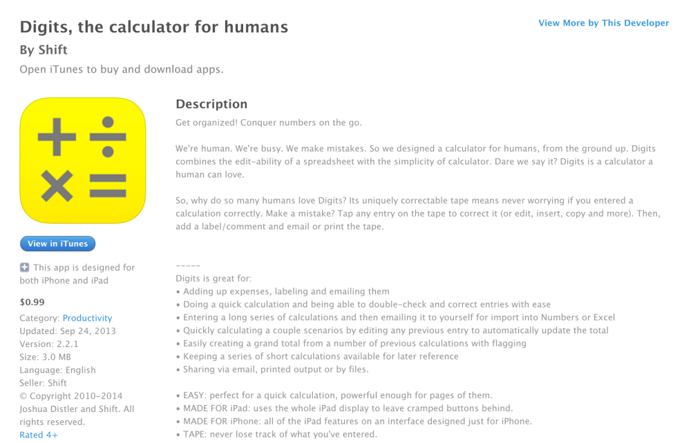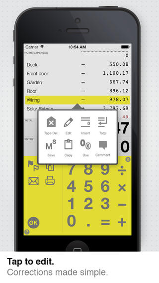 So, why do so many humans love Digits? Its uniquely correctable tape means never worrying if you entered a calculation correctly. Make a mistake? Tap any entry on the tape to correct it (or edit, insert, copy and more). Then, add a label/comment and email or print the tape.