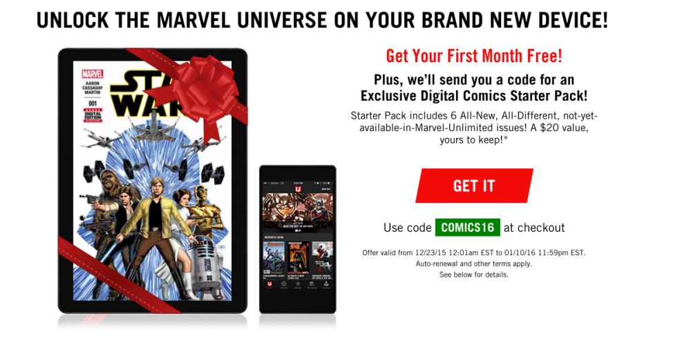 Marvel is once again offering a 1-month Marvel Unlimited subscription for free when you use the code COMICS16. Regularly $9.99, new subscribers will be able to get access to over 17,000 digital Marvel comics and as an added bonus you will also receive a code via email for an exclusive digital 6-comic starter pack.