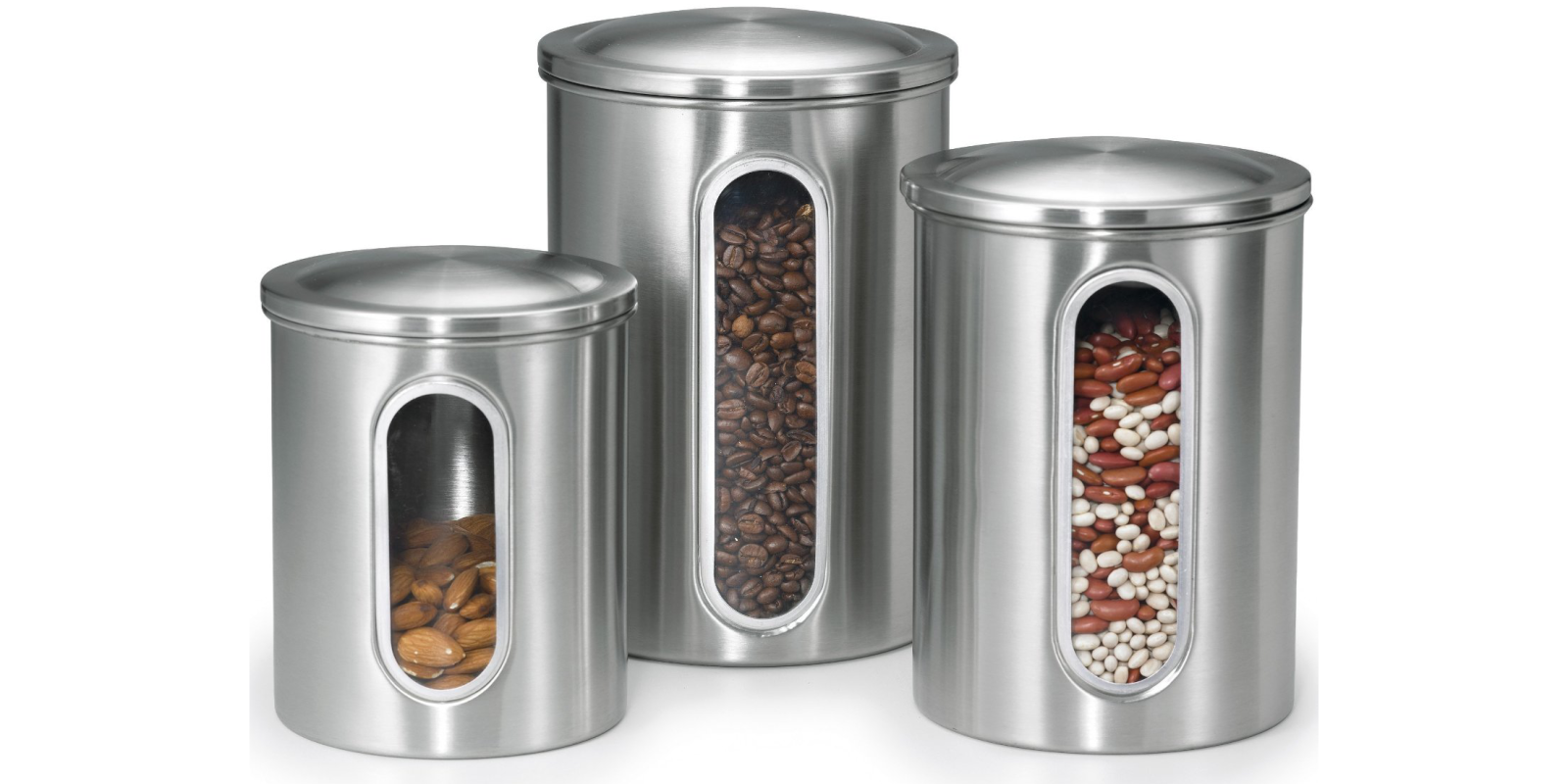 The set includes 2-quart, 3-quart, and 4-quart window canisters made of 18/8 stainless steel. They are great for keeping ingredients/other foods fresh and are dishwasher-safe. Rated 3.7/5 stars from nearly 200 Amazon customers.