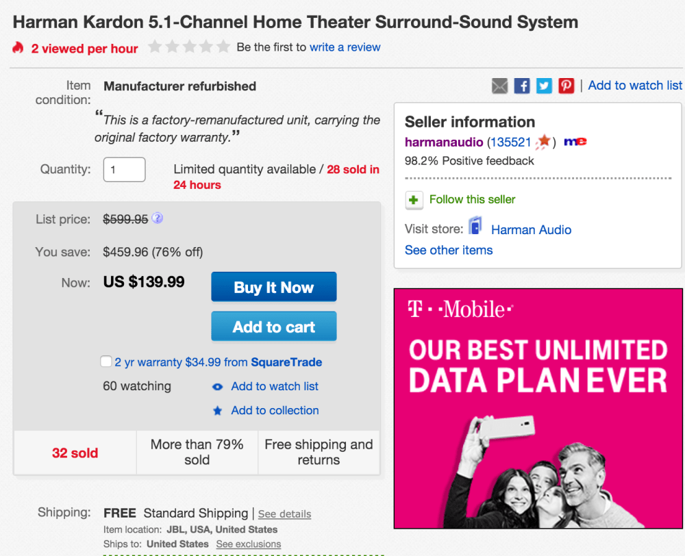Next up, Harman Kardon’s Official eBay Store offers its refurbished HKTS-16 5.1-Channel Home Theater Surround Sound System for $139.99 shipped. By comparison, this setup originally retailed for around $600 and still fetches $400 or more in new condition. Today’s deal is the best price that we can find. This system includes four satellites and one center speaker plus a 200 watt subwoofer. A one-year manufacturer’s warranty is included with purchase. Rated 4.4/5 stars.