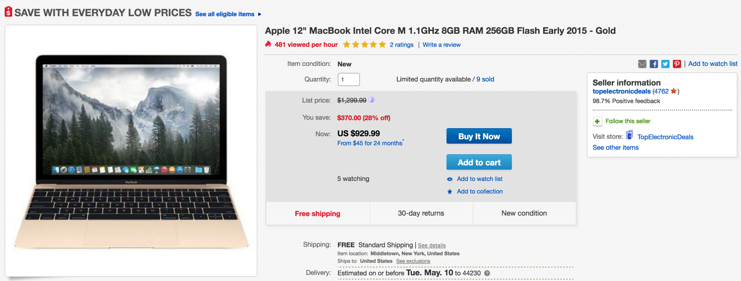 Top Electronic Deals (98.7% Positive feedback from 4,000+) via eBay offers the Apple 12-inch MacBook (Early 2015) 1.1GHz/8GB RAM/256GB in Gold for $929.99 shipped. That’s $39 less than this third-party Newegg listing, $69 less than most other retailers/Amazon and it’s the same price Apple charges for a refurbished model. It has a 1.1GHz Dual-Core Intel Core M Processor (Turbo Boost up to 2.4GHz), 8GB of 1600 MHz LPDDR3 RAM, a 256GB solid-state drive and ships with OS X Yosemite.
