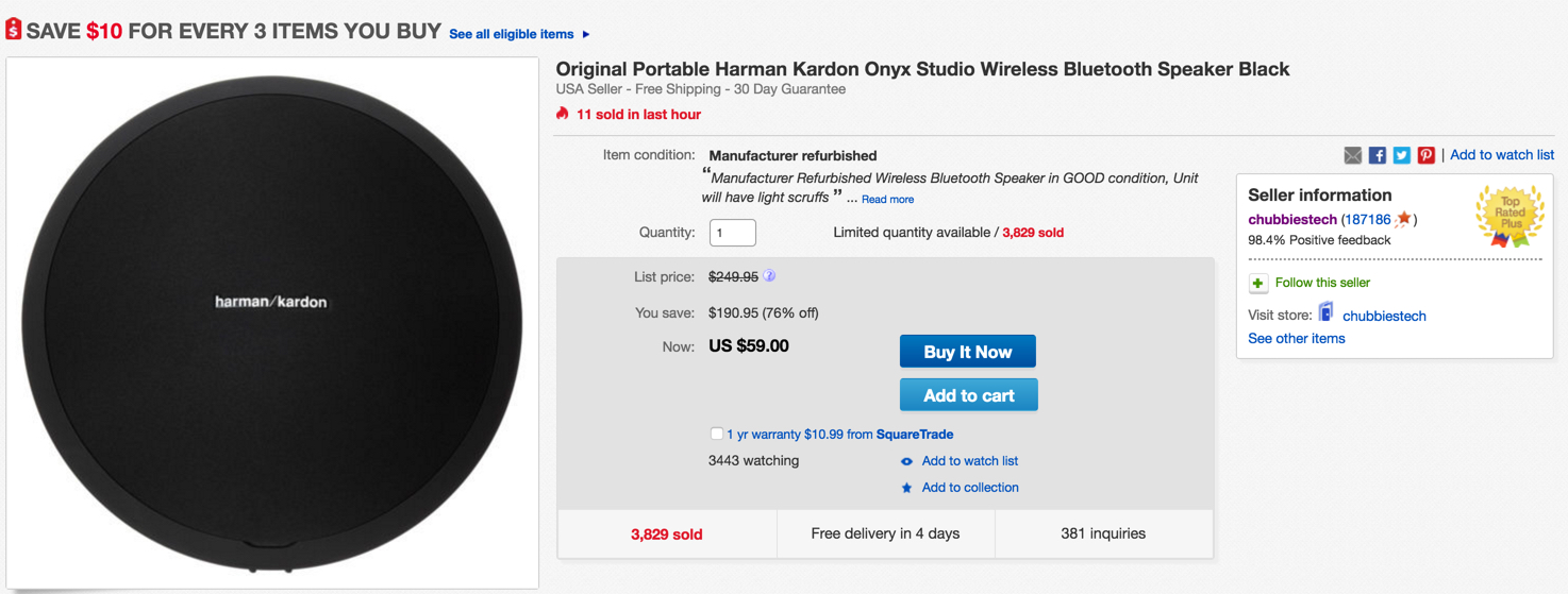Chubbiestech (98.5% positive feedback from 185,000) via eBay once again offers the manufacturer refurbished Harman Kardon Onyx Studio Wireless Bluetooth Speaker for $59 shipped. That’s $340 off the original list price, $60 less than Amazon’s listing for a new one and tied with our previous mention for the lowest we’ve seen.