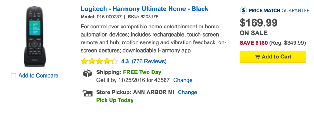 Best Buy’s official eBay Store offers the Logitech Harmony Ultimate Home Universal Remote for $169.99 shipped. Also available direct. That’s good for $350 off the original price, down $60 from B&H, and the best current offer available.