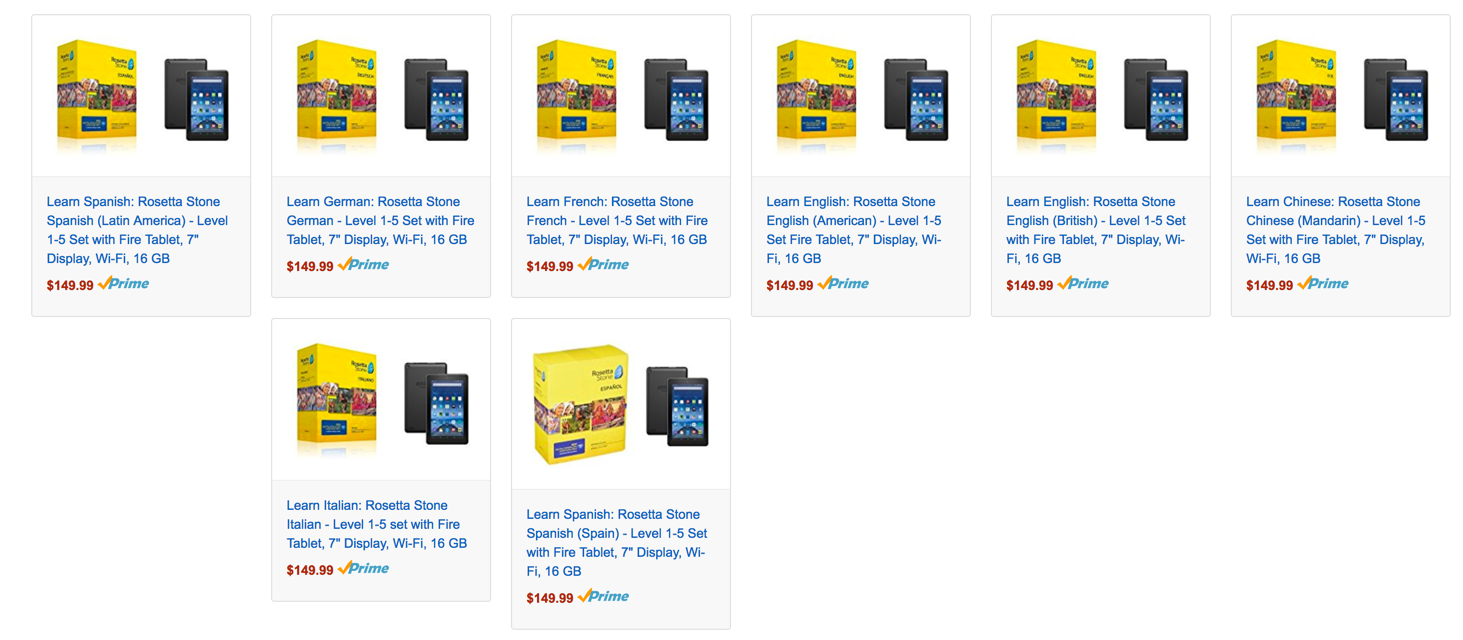 As part of today’s Gold Box Deals, Amazon is offering Rosetta Stone Level 1-5 sets on CD in eight different languages, bundled with an Amazon Fire HD 7 16GB for $149.99 shipped. That’s about $70 off the price of getting these items separately and the lowest bundled price we’ve seen.