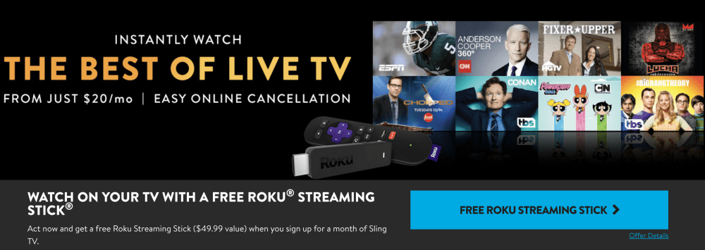 After briefly doing so at the end of 2016, Sling TV is once again offering a free Roku Streaming Stick when you pre-pay for a single month of service. Prices start at just $20/mo., and the Roku Stick has a list price of $50, so you’re really getting a nice value here. Note: this offer is available to new customers only. After one-month, your subscription will automatically roll-over.