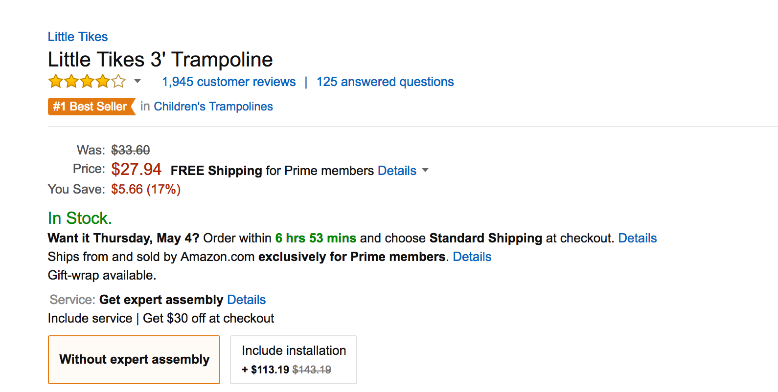 Reg. $50/$28Amazon is offering tis Prime members the Little Tikes 3-Foot Trampoline for just $27.94 shipped. Matched at Walmart. That’s almost half the regular $50 price tag, the lowest Amazon has offered it for and the best we can find. It’s rated 4+ stars from over 1,940 customers on Amazon where it is the best-selling children’s trampoline.