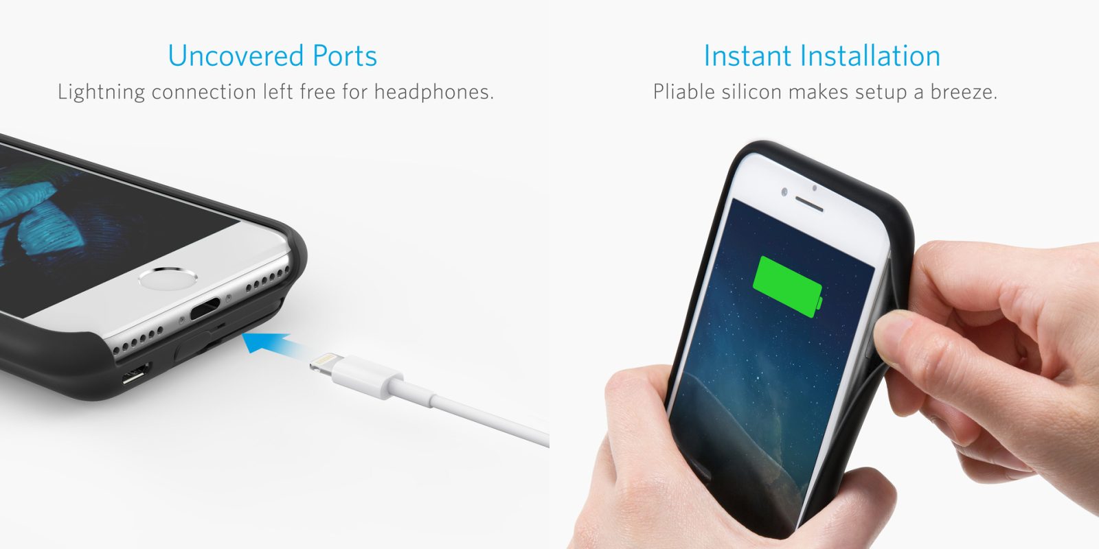 Add only 0.23in to your iPhone for a massive 80% battery increase. That’s over 10 extra hours of video, surfing or talktime. Designed to be used with the iPhone 7 with soft silicone for instant installation. Works with iPhone 6 and 6s. MFI certification ensures PowerCore Case works safely with your iPhone. Its fit is designed for iPhone 7 but works with iPhone 6 and 6s.Unlike other battery cases, the Lightning port is kept free for headphones and other accessories when not charging.