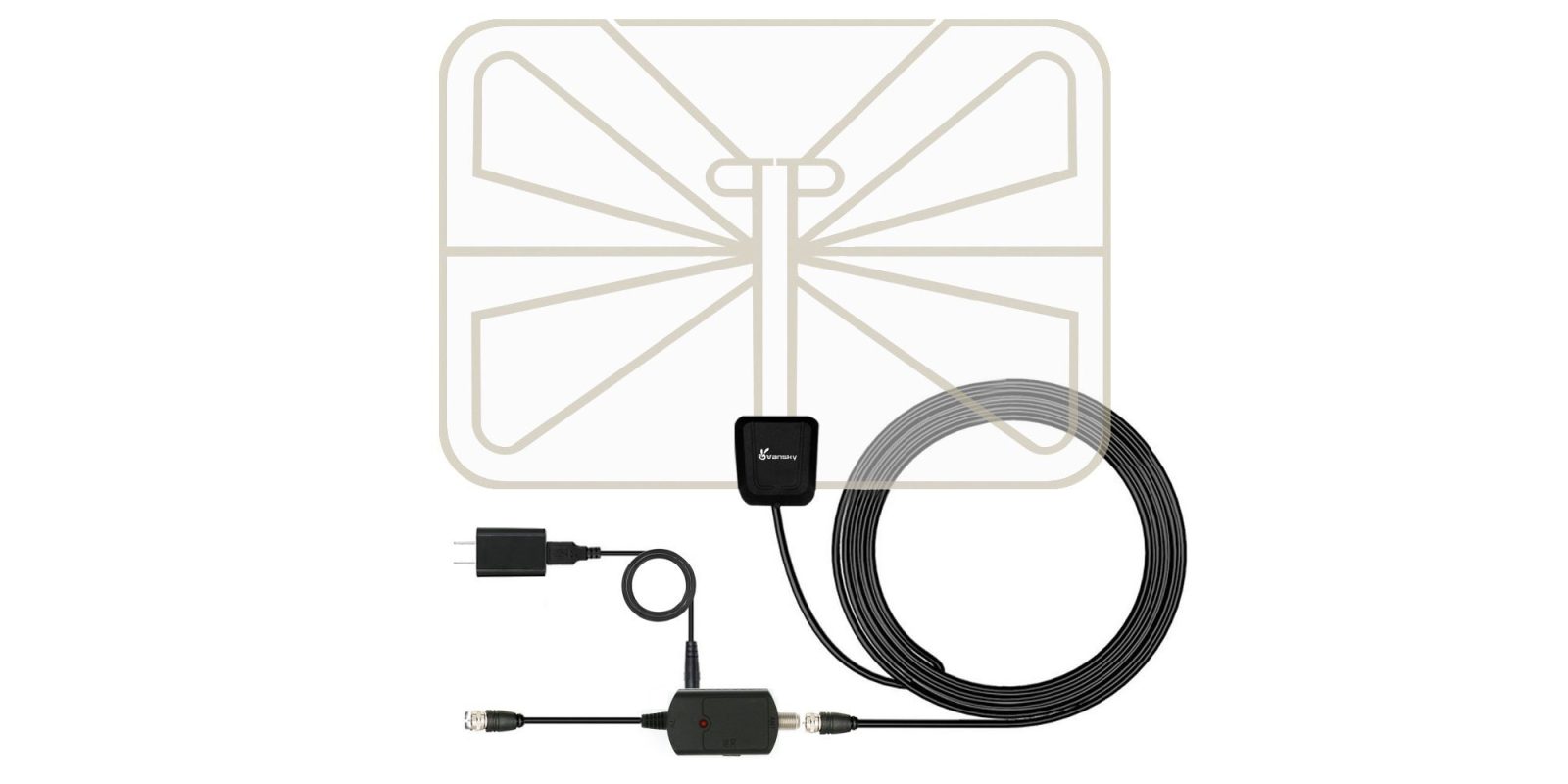 - Vansky indoor tv antenna with 16.5ft coax cable, USB power adapter with spare cable,Amplifier Signal Booster, Spare 3M Sticker.