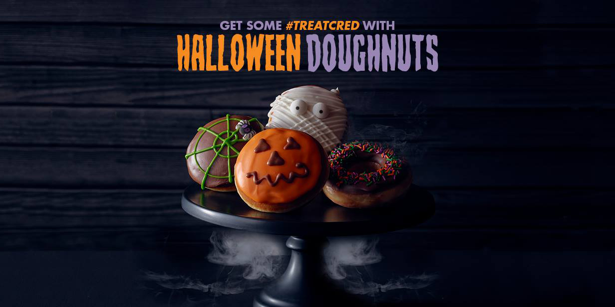 Ain’t no party like a Halloween Doughnut party! On October 31st, wear a costume to a participating Krispy Kreme location and get one free doughnut of your choice. (US/CAN). Scary, silly or sweet – we want to see your pics of Halloween fun at Krispy Kreme! Post a picture of you and use #TreatCred. Offer good on October 31st only. No purchase necessary. Offer valid from regular opening time to regular close of business time at each participating shop. While supplies last. One doughnut per customer.