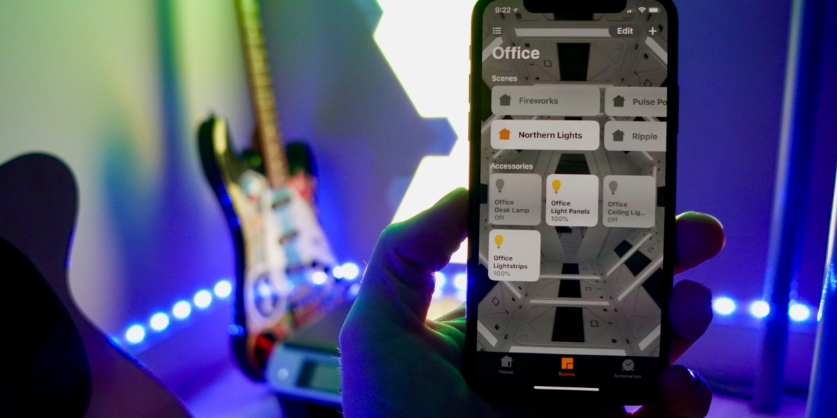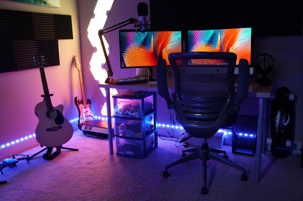 A set of Nanoleaf Light Panels covers the corner wall behind my desk an creates an ambient experience with impressive lighting effects. The ceiling light is connected to a Lutron wall dimmer switch, a second desk behind mine includes a lamp with a colored Hue bulb, and Hue light strips line the baseboard on three walls. All of the lighting connects to Apple HomeKit for Siri control.