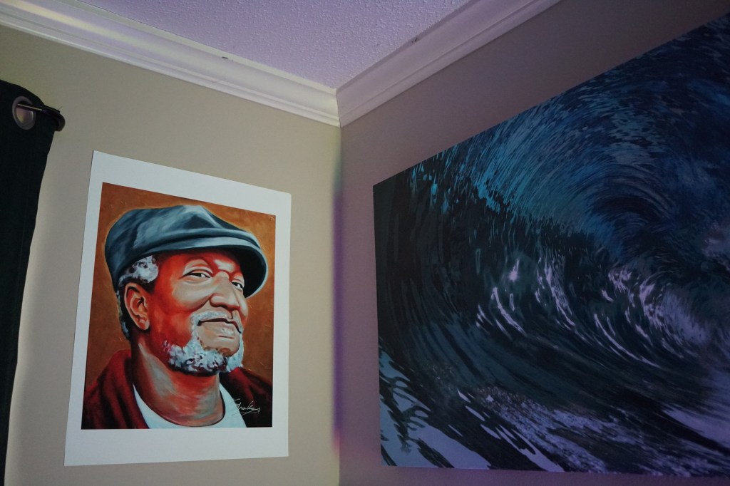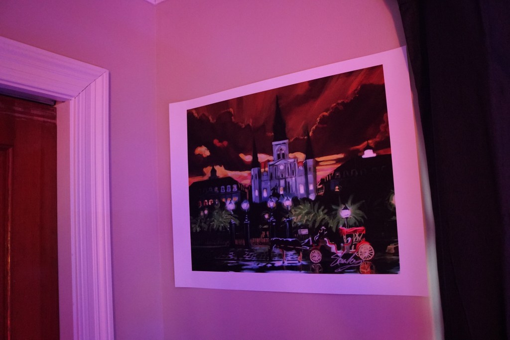 Wall art from the French Quarter in New Orleans (and the frame section at Bed, Bath & Beyond) help make my office feel more personal, and my small guitar collection and skateboard serve to keep me balanced.