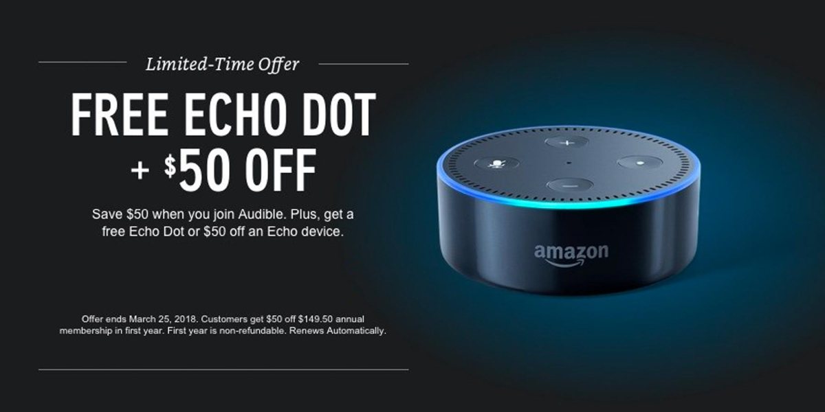 Audible is currently running a sale on its 1-year annual membership. Giving $50 off, it drops from the normal price of $150 for the year to $99.50. Also included with the year membership is a FREE Echo Dot or $50 off your choice of Amazon’s Echo devices. That’s a total savings of $100, and one of the best deals we’ve tracked. Head on over to the Amazon login page to sign up or Audible’s website for more information. Note: You’ll need to sign into your Amazon account or sign up in order to use Audible.