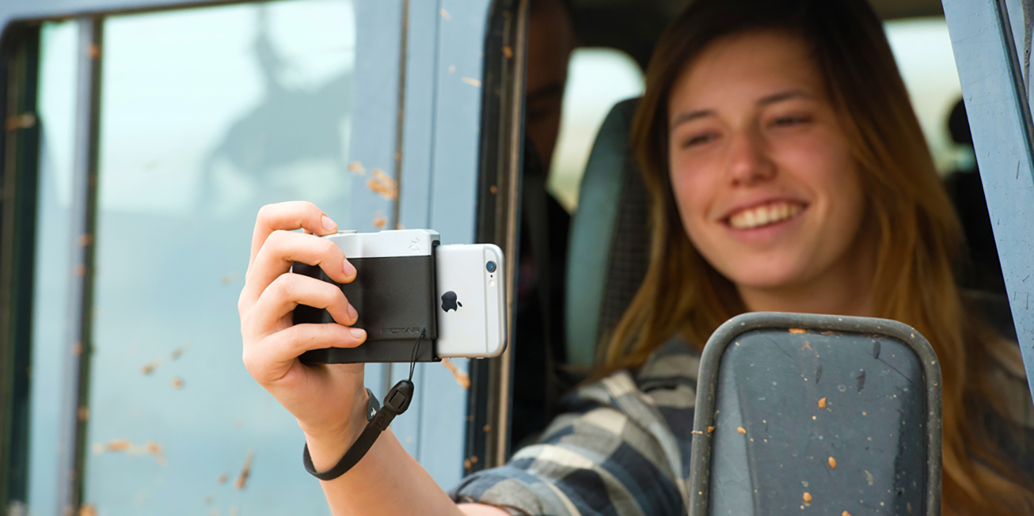 Enhance your smartphone photography with the Pictar Camera Grip for Select Standard Smartphonesfrom Miggo. This ergonomic grip features wheels and buttons that, when paired with the accompanying app, give you greater control over your photography and let you use your smartphone camera one handed, even with gloves. It works by emitting high-frequency sounds that are detected by the free Pictar app via the microphone, saving battery over other wireless methods of communication. The Pictar is coated with anti-slip material and comes with a wrist strap and a padded neoprene pouch.