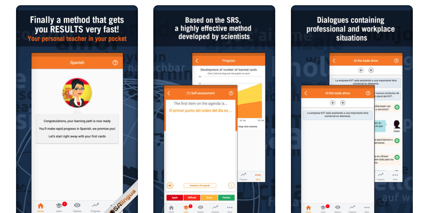 By strategically helping you memorize key phrases, vocabulary and expressions in your speciality, MosaLingua gives you the tools to naturally speak Spanish in a professional context. And with its integrated dialogues, the app exposes you to business Spanish, naturally improving your oral comprehension and speaking skills.