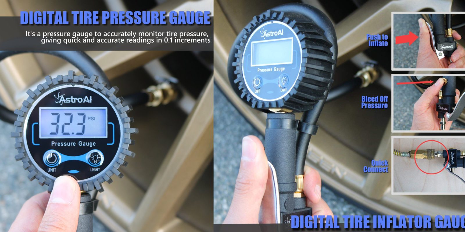 - ALL-IN-ONE: The LED backlit screen features measurements in PSI, KPA, Bar, and Kg/cm²; Includes an inflation gun, chuck, gauge, hose, and bleed valve, all in one unit; Compatible with ¼”” NPT air compressors output