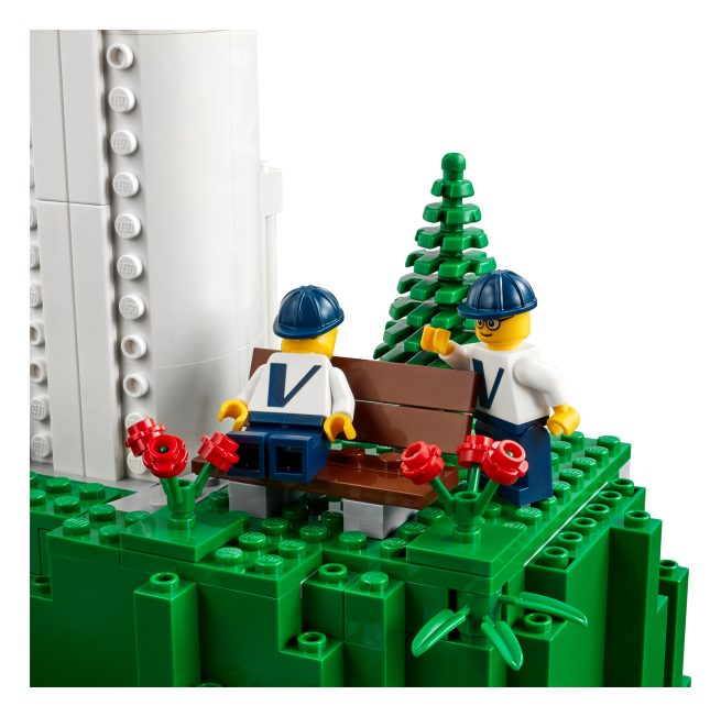 - This LEGO® Creator Expert Vestas® Wind Turbine set also features adjustable wind turbine blades, detailed tower, movable nacelle with aircraft warning lights, Vestas service vehicle, trees, greenery and a house with garden, flowers, picket fence and a patio with 2 chairs, table and a parasol.