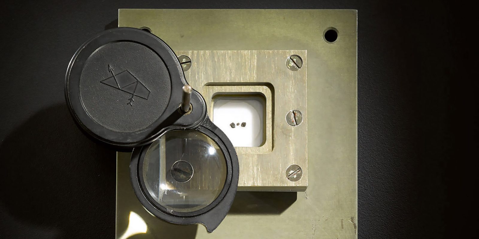 The lunar sample comes encased under glass paired with an adjustable lens for close-up viewing. The item is completed with a plaque labeled “ЧАСТИЦЫ ГРУНТА ЛУНЫ-16” or “SOIL PARTICLES FROM LUNA-16” for non-Russian speakers.