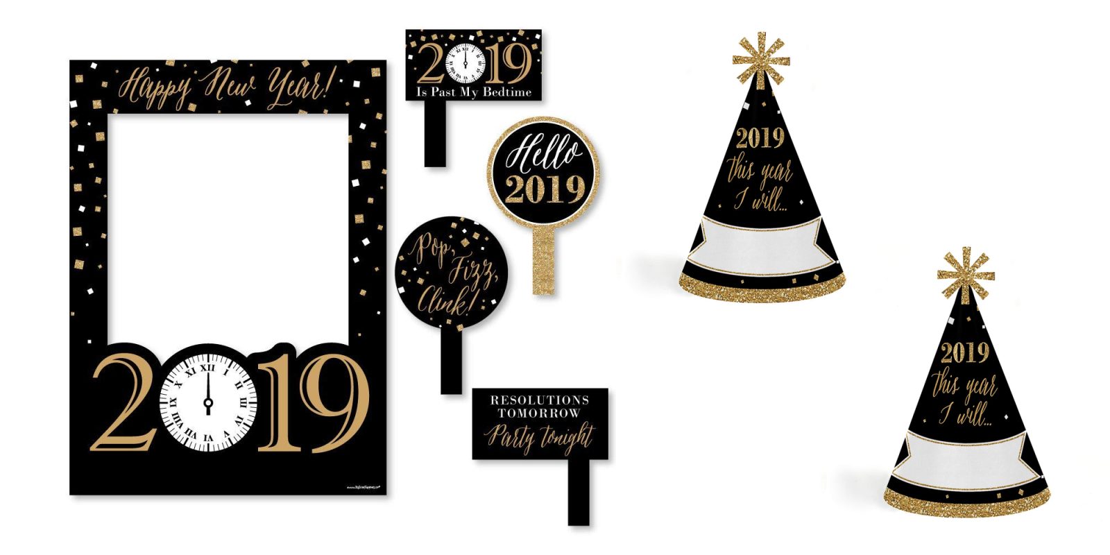 - 20-Piece New Year’s Eve Party Photo Booth Props Kit INCLUDES 20 Gold 2019 New Year’s Eve photo booth props, 20 wooden dowel sticks and adhesives for assembly. EASY ASSEMBLY: Simply attach the printed DIY photo booth props to the wooden dowels with included adhesive and reinforcing stickers.