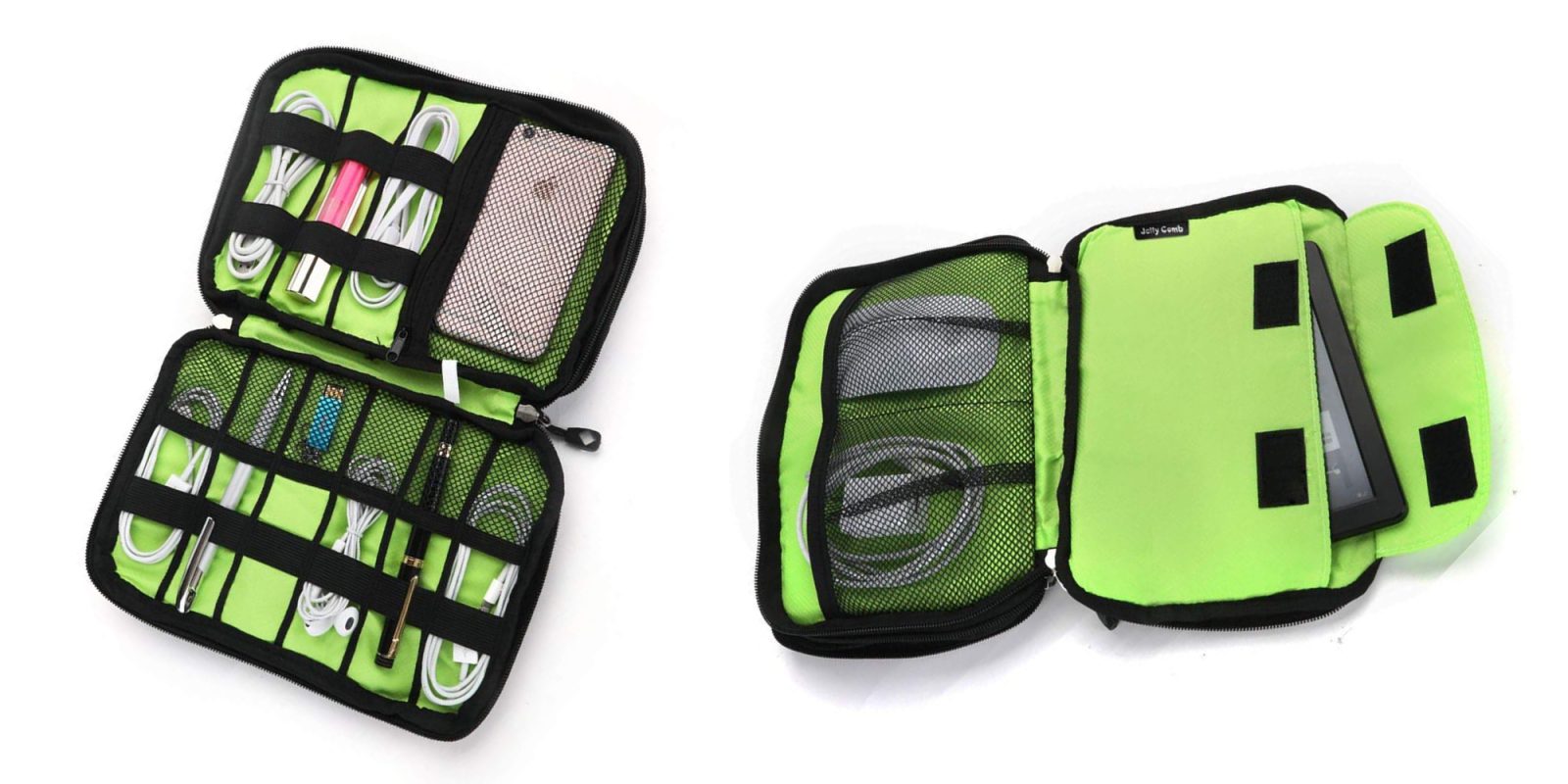 - Keeps things organized. The electronics storage bag has 2 layers Nylon interior compartment with enough space to take in your cables, USB drive, cellphone, charger, mouse, kindle, mini tablet and other accessories.