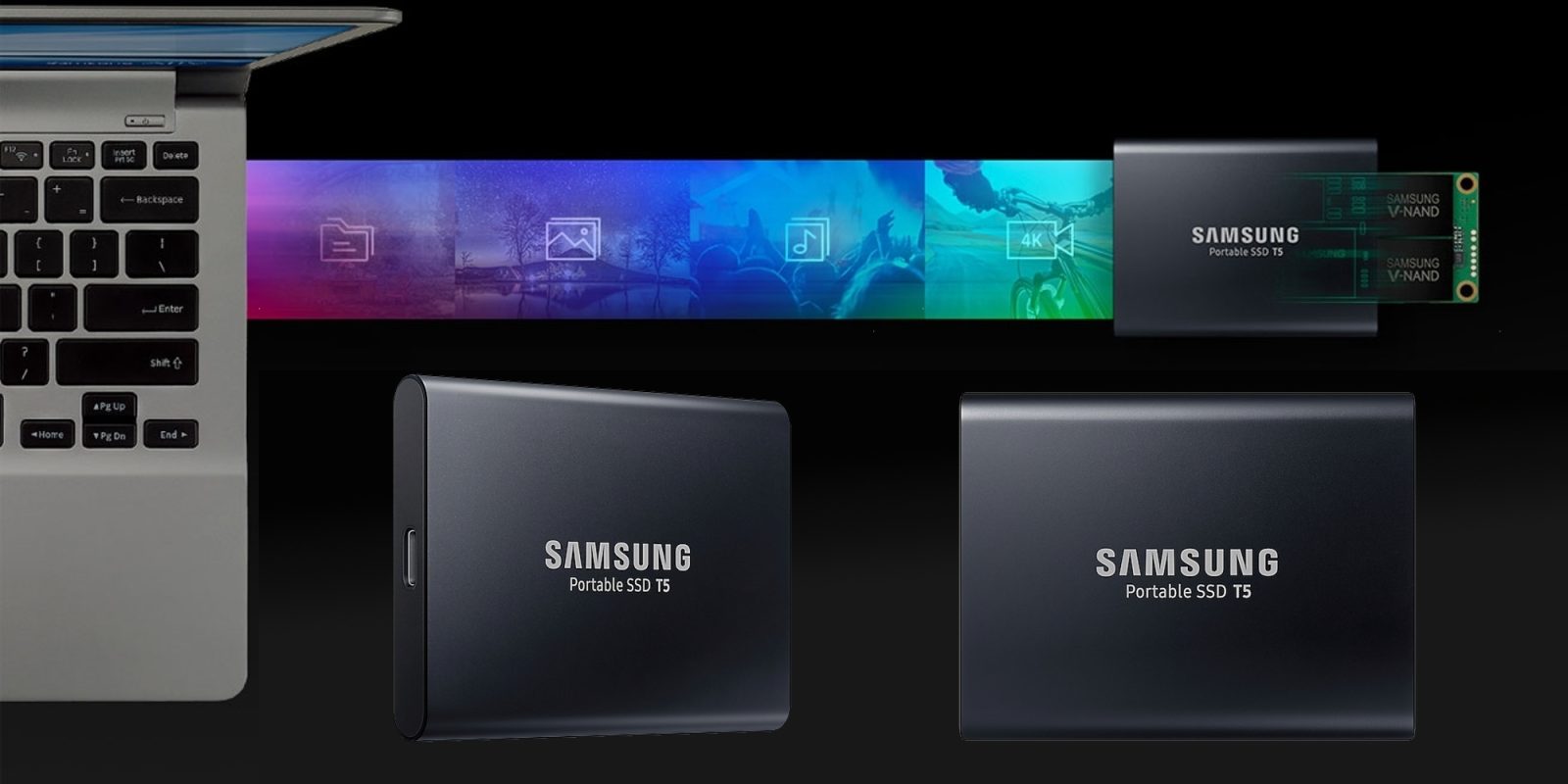 The Samsung Portable SSD T5 elevates data transfer speeds to the next level and unleashes a new experience in external storage. With a compact and durable design and password protection, the T5 is truly easy to carry and stores data securely.