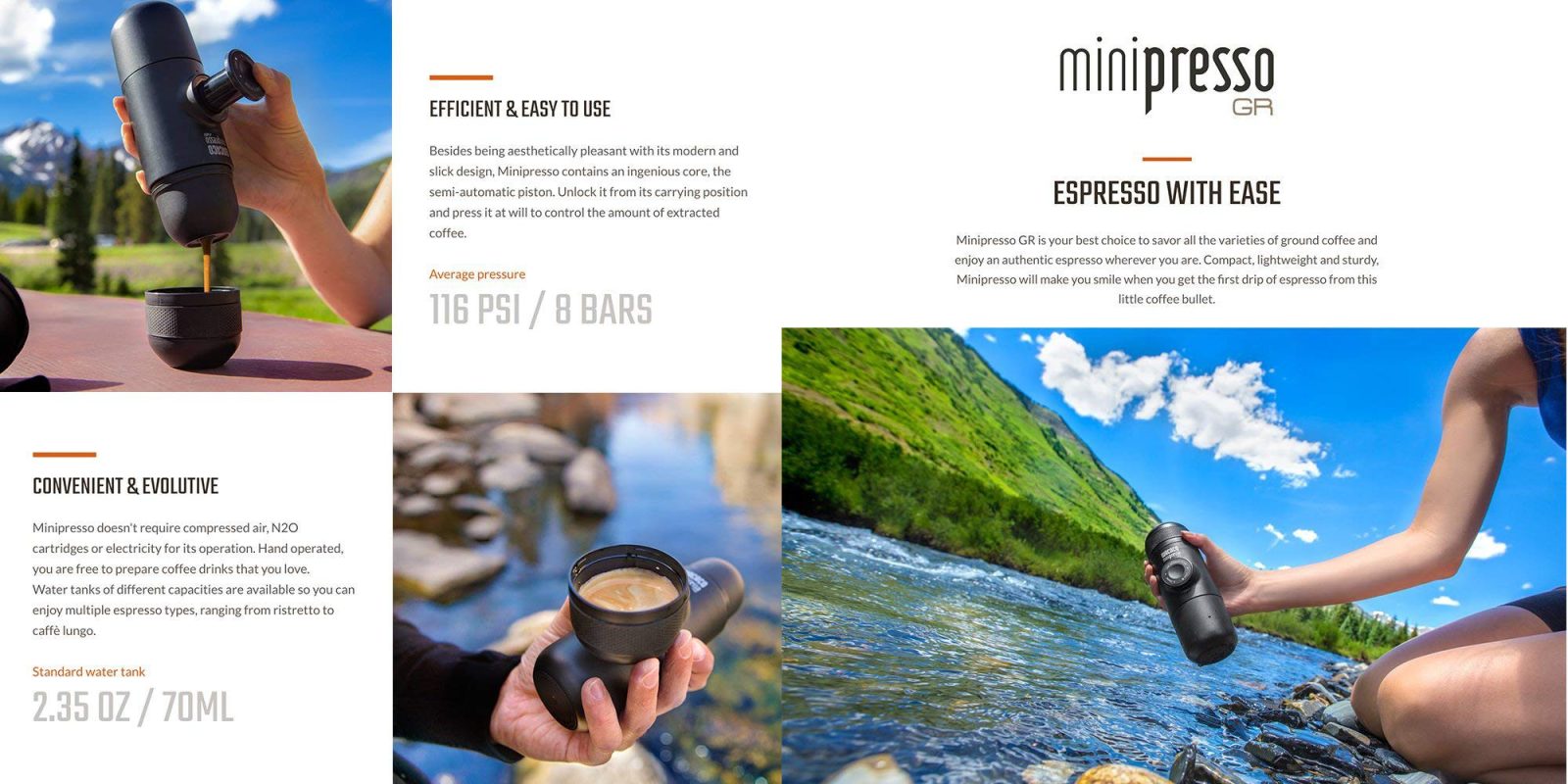 - COMPACT & FEATHERWEIGHT – Whether you’re going away for few hours or few weeks, space and weight are major factors when selecting your travel equipment. Minipresso has been designed to be the smallest, lightest and most versatile handheld espresso machine
