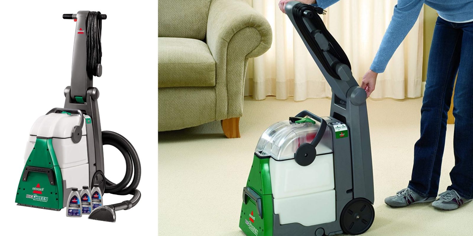 The BISSELL Big Green Professional-Grade Carpet Cleaner achieves a whole new level of clean by outcleaning the leading rental carpet cleaner.* Powerful motors, an extra-large PowerBrush to pull out deeply embedded dirt, and powerful suction are just a few features that make this deep cleaner stand out from the rest. Two simple tanks keep the clean and dirty water separated for easy cleanup and fewer trips to the sink.