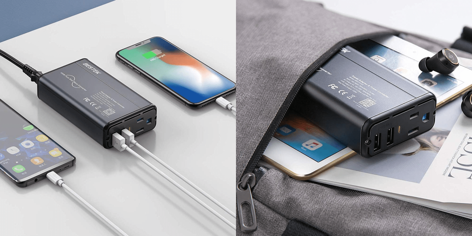 BESTEK Pure Sine Wave Power Converter with two USB ports and one AC outlet, meet the charging needs of all appliances below 150w, including the hair straightener, hair curler, electric toothbrush. Convert all voltage from 100-240V to 110-120V, to powers up all your US electronic devices, and thanks to pure sine wave technology, this converter has no damage to the appliances like others, and extend 30% of the service life. With NRTL safety tested, and the converter support ETL Certification.