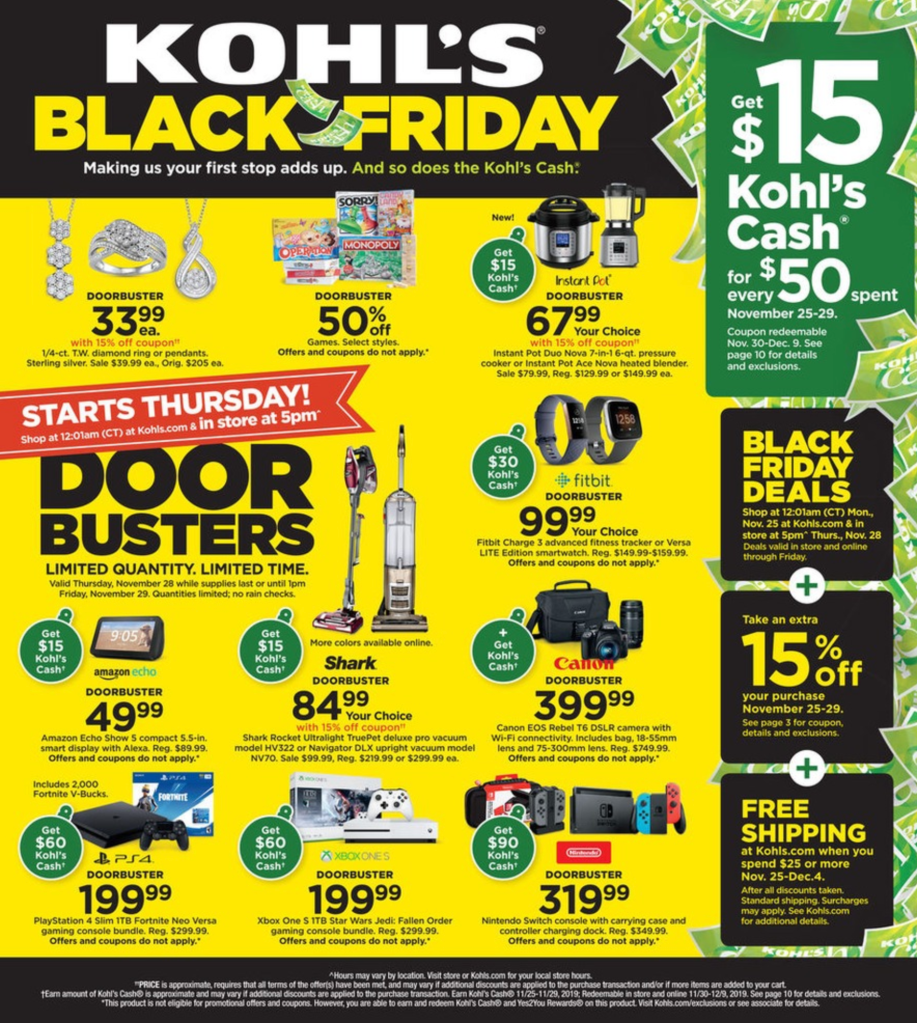 Kohl’s will offer free shipping on orders over $25 starting November 25th through December 4th. In the lead up to Black Friday, Kohl’s will also be offering an extra 15% off just about everything from November 25th to November 29th.
