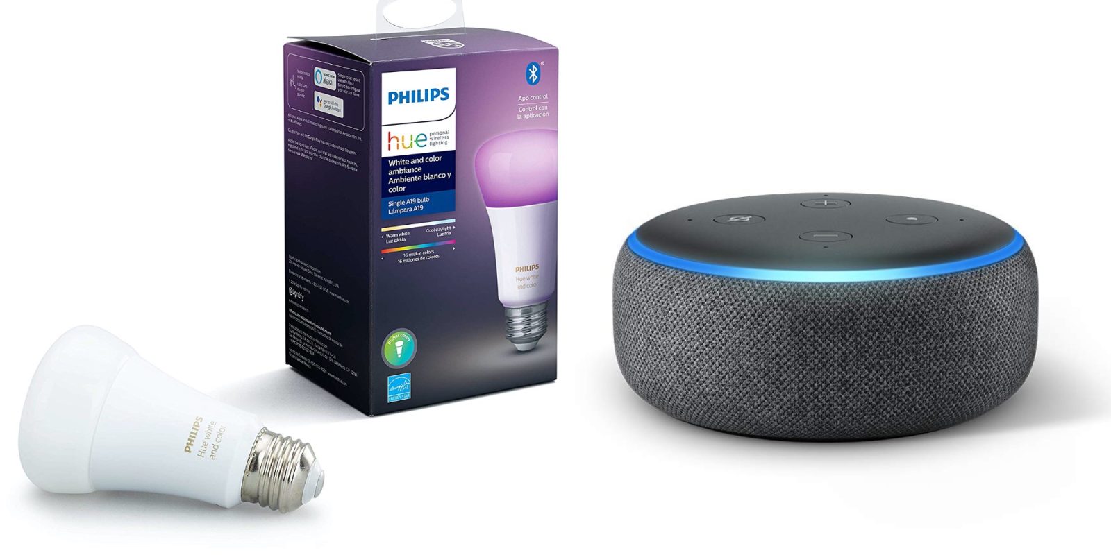 - This bundle contains Echo Dot (3rd Gen) – Heather Gray and the Philips Hue White & Color 2-pack A19 Smart Bulb, Bluetooth & Zigbee compatible
