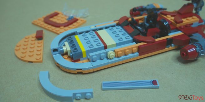 With Luke Skywalker’s Landspeeder, you get pretty much what you expect from the name of this kit. The main build assembles the landspeeder, which measures over 7-inches long. This is a vehicle that we’ve seen in LEGO form plenty of times in the past, but its latest rendition packs some interesting building techniques and a surprising amount of detail. There are a few stickers that go into making that happen.