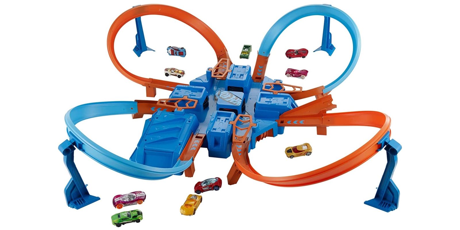 Crank up the competition with four intersecting crash zones and a car feeder ramp for challenging, high-octane action! Racers can line up their Hot Wheels cars and let ’em rip for near misses or total wipeouts. Drive kids’ creativity and experimentation with more than 16 feet of track with hairpin turns, motorized boosters, and a giant crash zone.