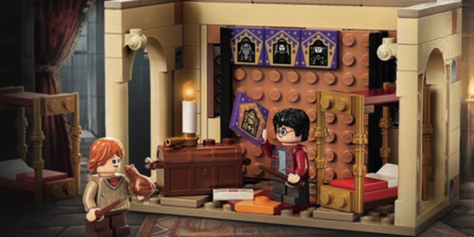 There’s no specific part count available yet, though the build sits on a 16 x 8 stud base plate and includes a bunk, chest, and some other accessories. The more interesting aspect will surely be the Harry and Ron minifigures that round out the set with some wizard cards.