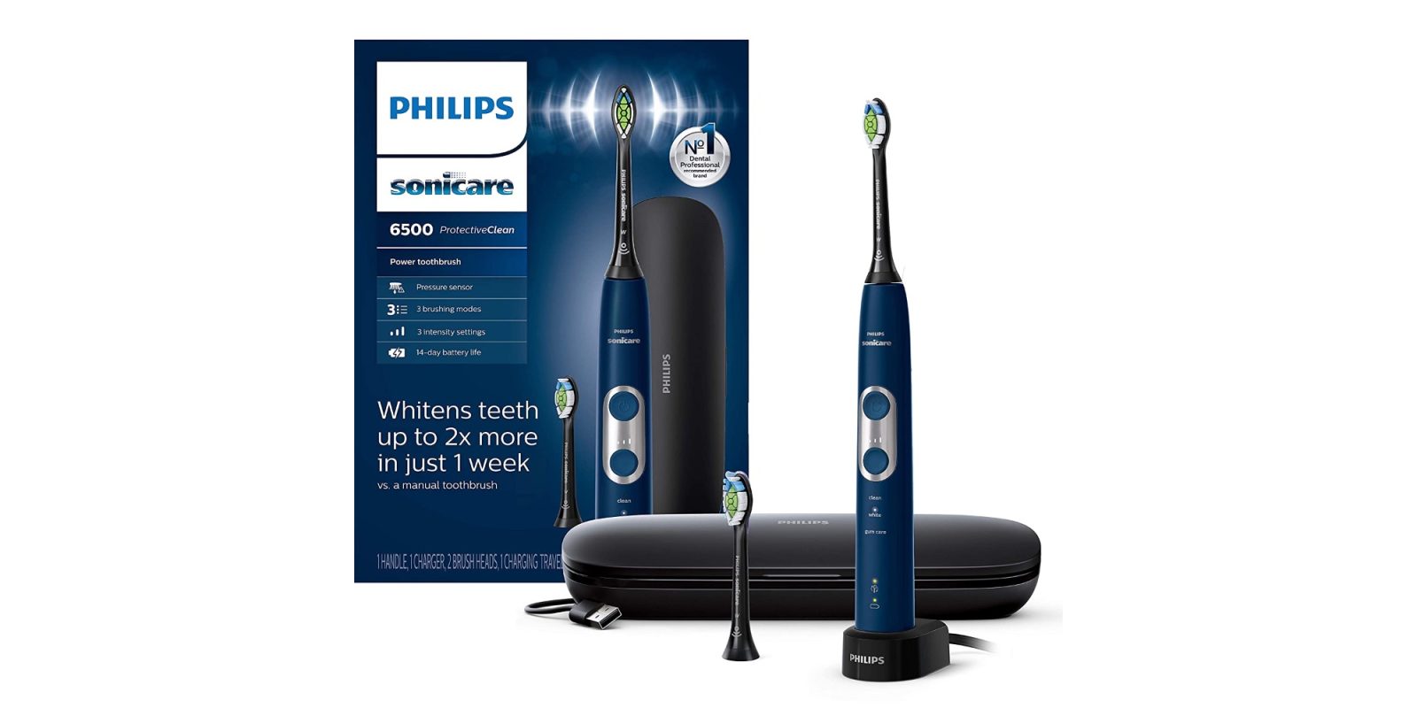 Protective Clean 6500 rechargeable electric toothbrush delivers up to 100% less stains in just 7 days to whiten your teeth in just 1-week vs a manual toothbrush. It has a pressure sensor that protects your teeth and gums from excess brushing pressure. Brush heads wear out over time. Our Brush head Replacement reminder tracks how long you have been using your Diamond Clean brush head and how hard you have been brushing. It will beep to inform you when to replace your brush head. Customize your own brushing experience with 3 intensity settings and your choice of 3 modes.