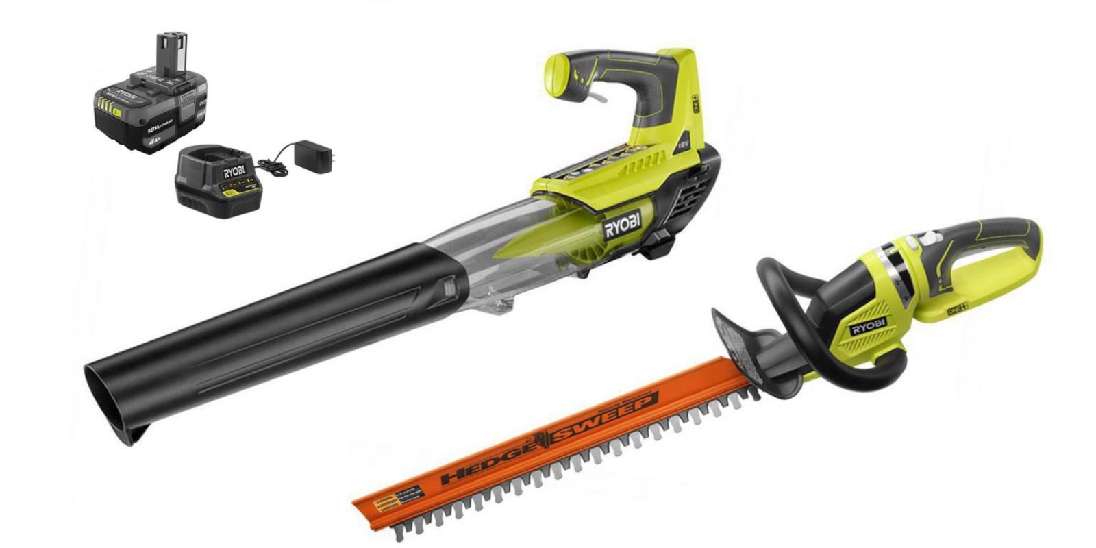 With 2X the power and 50% more run time than the previous model, the RYOBI 18V Lithium+ Jet Fan Blower is perfect for any yard. This blower features a jet fan design that provides power up to 100 MPH and 280 CFM and a variable speed trigger that allows the user complete control. At 6 lbs. this blower is lightweight and easy to operate. There is a hanging hook for simple storage and a debris scraper for loosening stubborn dirt and leaves. Also included, the RYOBI 22 in. 18V Cordless Hedge Trimmer is ideal for any hedge maintenance around the house.