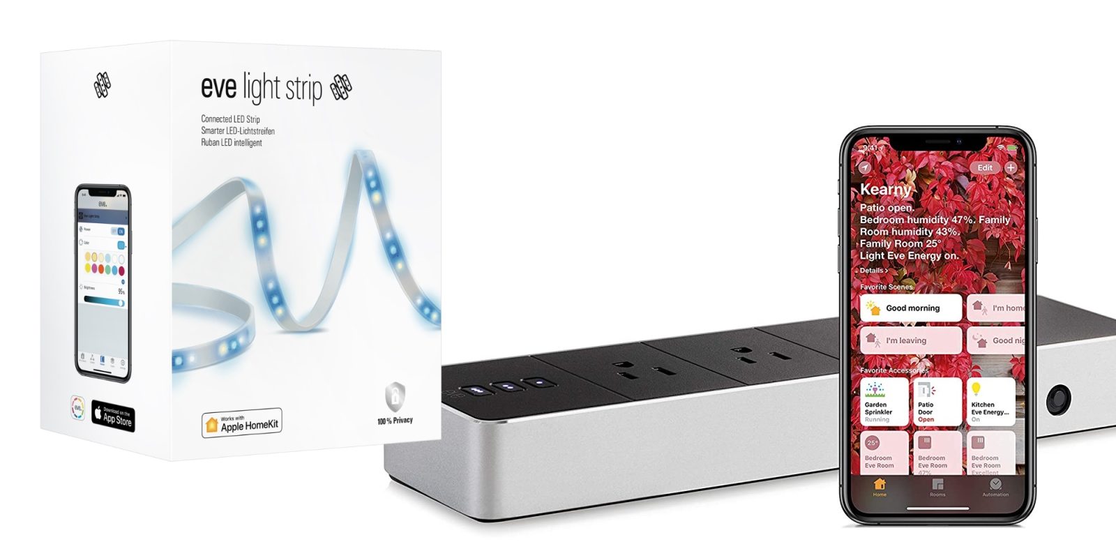 Power users rejoice. With Eve Energy Strip, individually control three outlets with the app or Siri. Put devices on autopilot. Rest assured that your appliances are safeguarded by overcurrent, overvoltage, and surge protection. Plus track their combined power consumption. Equipped with cutting-edge Apple HomeKit technology, and crafted to absolute perfection, Eve Energy Strip connects directly to your Wi-Fi network without a bridge. And never sends your private data to a cloud.