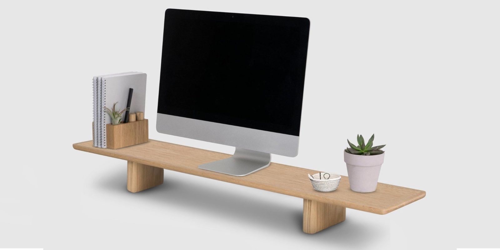Increase your desk space and relieve neck, back, and shoulder strain with our solid wood monitor stand. Made out of your choice of white oak or walnut, our monitor stand is a simple, yet beautiful way to prop up your monitor, no matter what desk you use. Each of our monitor stands are built by hand at our studio located in California. We cut, mill, and assemble each one by hand and then seal them using a high performance water-based finish which keeps the wood look natural while also being protected from liquids and such.
