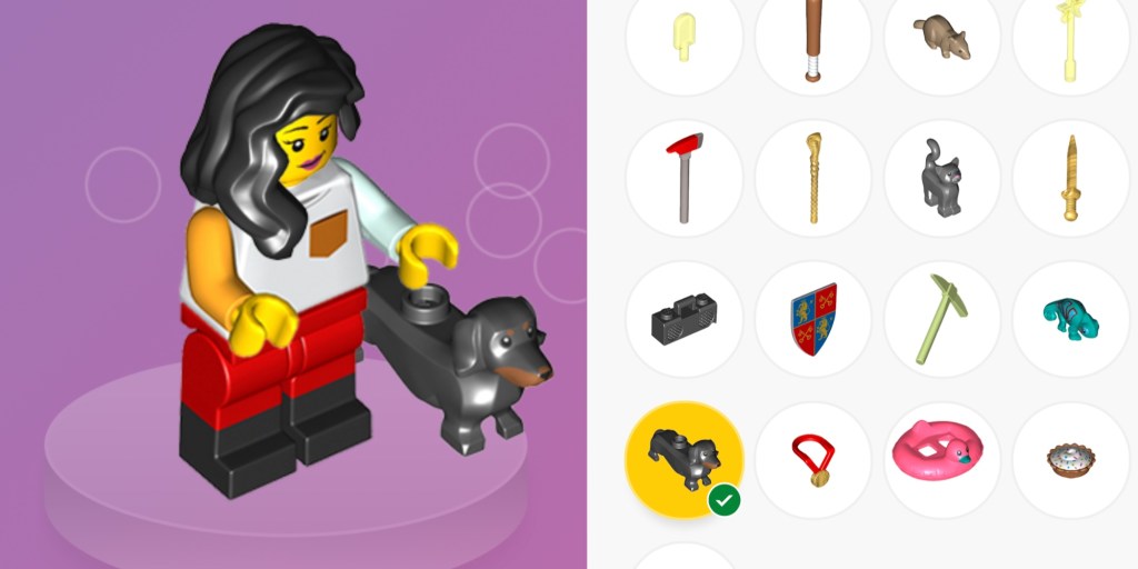 Then there are the actual accessories and pieces available for each of your custom characters. As of now, the actual assortment is limited compared to what you’d find in-store. There is a pretty decent number of heads, hairpieces, torsos, and even dual-molded legs, but you won’t be finding some of the more fun or eccentric bricks that have popped up at retail locations in the past. Accessories are also quite limited, but there are some interesting inclusions like the recent dachshund dog and more.