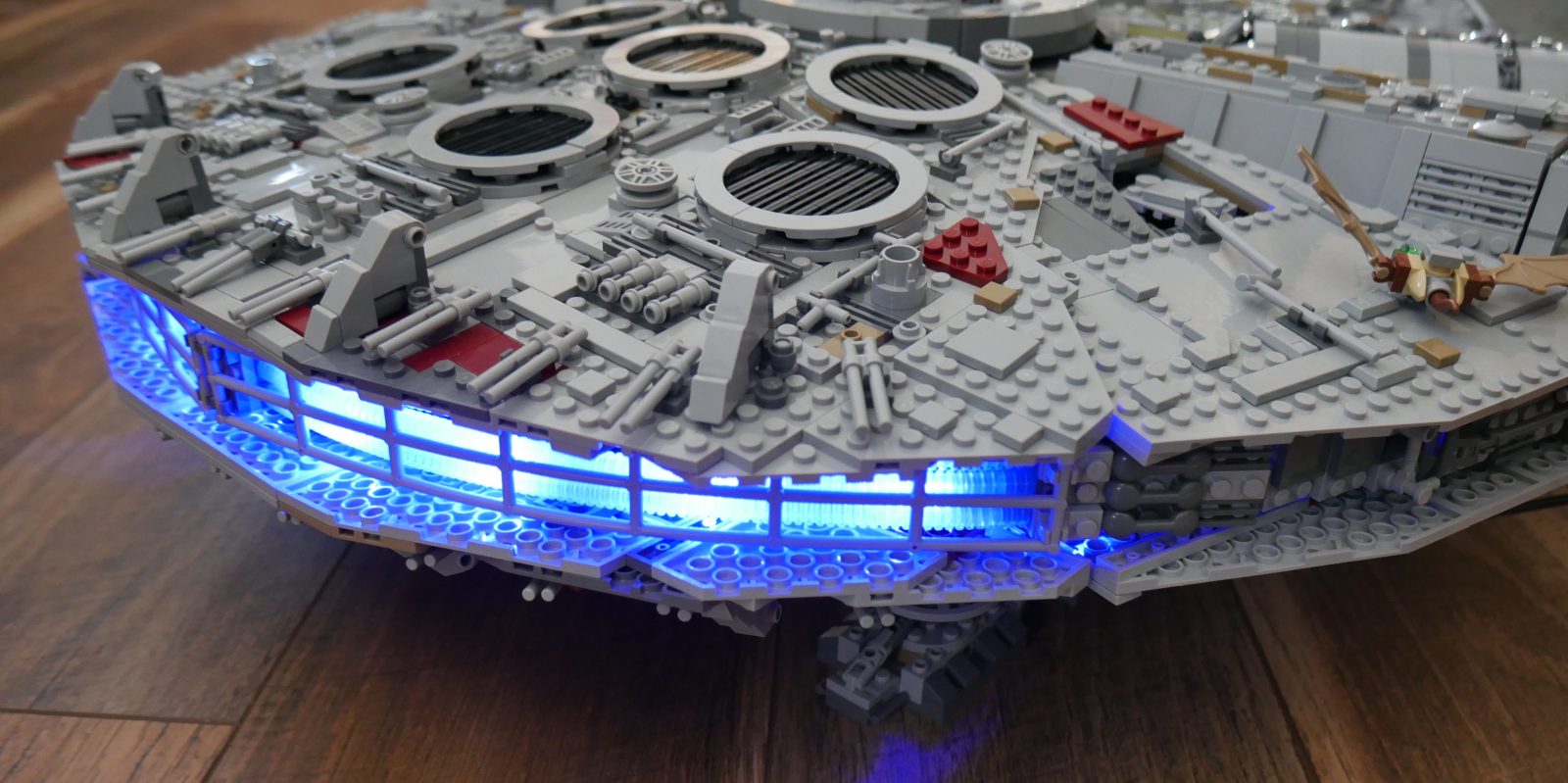 Welcome to the largest, most detailed LEGO Star Wars Millennium Falcon model weve ever createdin fact, with 7,500 pieces its one of our biggest LEGO models, period! This amazing LEGO interpretation of Han Solos unforgettable Corellian freighter has all the details that Star Wars fans of any age could wish for, including intricate exterior detailing, upper and lower quad laser cannons, landing legs, lowering boarding ramp and a 4-minifigure cockpit with detachable canopy. Remove individual hull plates to reveal the highly detailed main hold, rear compartment and gunnery station.