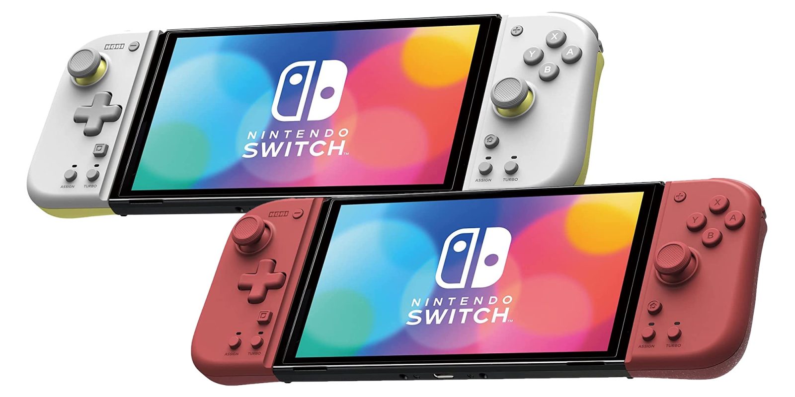 The Split Pad Compact attaches to the Nintendo Switch™ system to provide a full-size controller experience in Handheld Mode. The ergonomic form factor fits your hands perfectly for increased comfort and control. Features include full-size analog sticks and D-pad, turbo functions, and assignable rear buttons. Available in Light Gray & Yellow and Apricot Red colorways.
