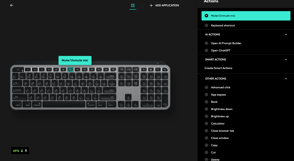 The Keys section of the app allows you to completely customize the top row. You can apply AI actions, create grouped shortcuts to trigger multiple actions on your system, or change the functionality completely – I can have the mic mute button I would personally never use take a screenshot, open Launchpad, an emoji menu, and much more – just note there are special dedicated keys already on this keyboard for opening the calculator on your Mac and taking screenshots, among other things.