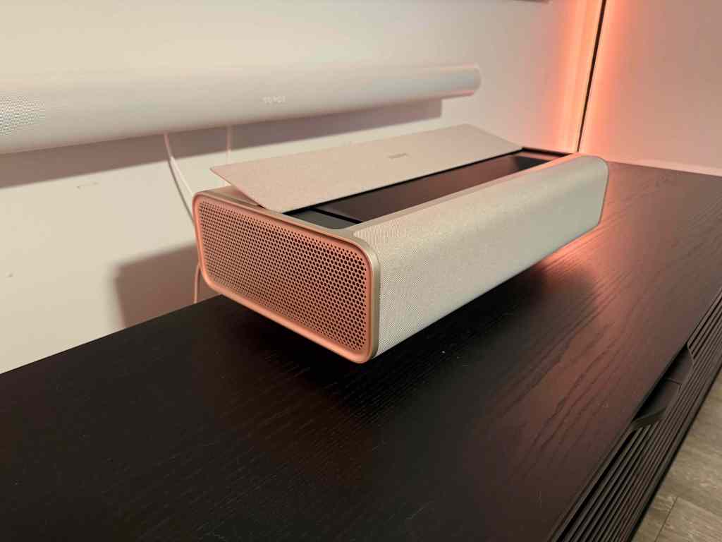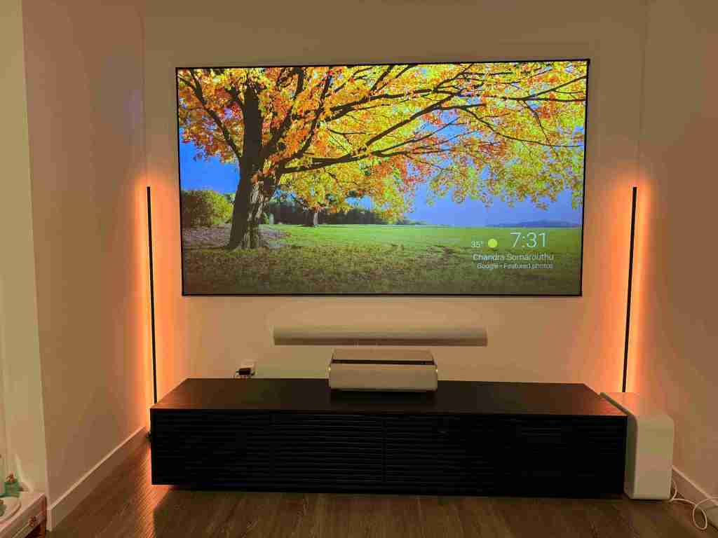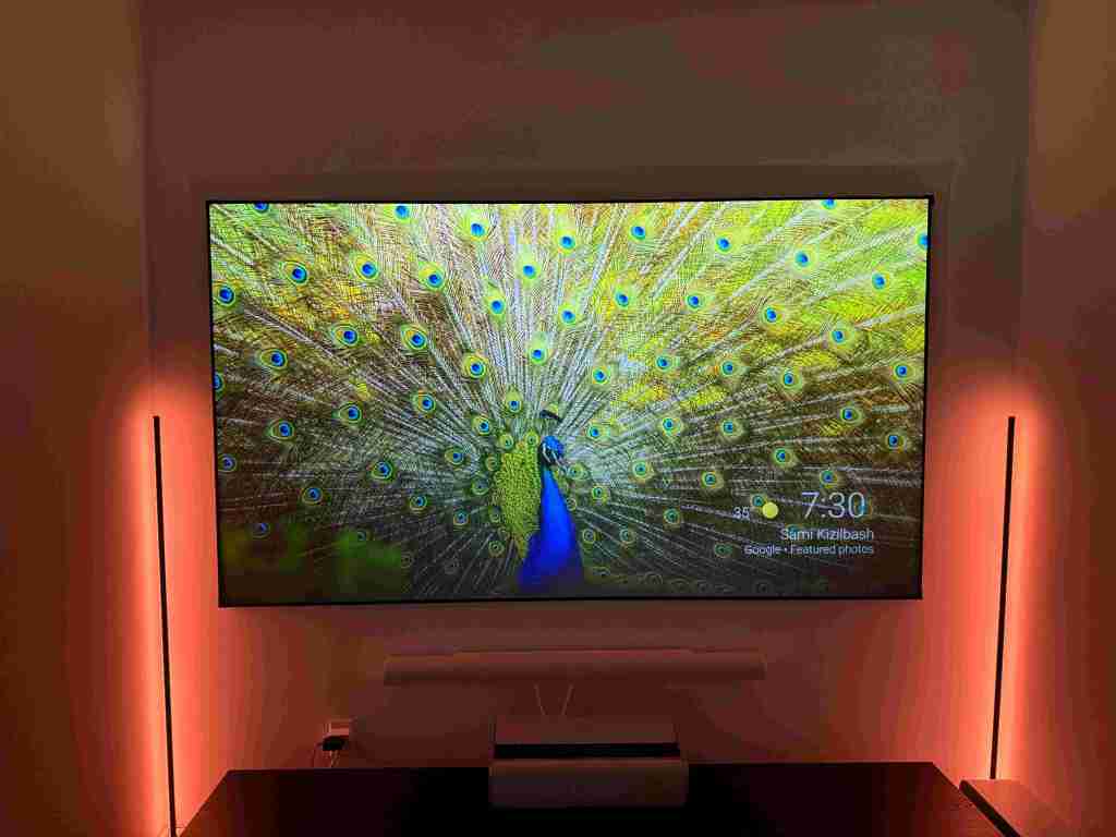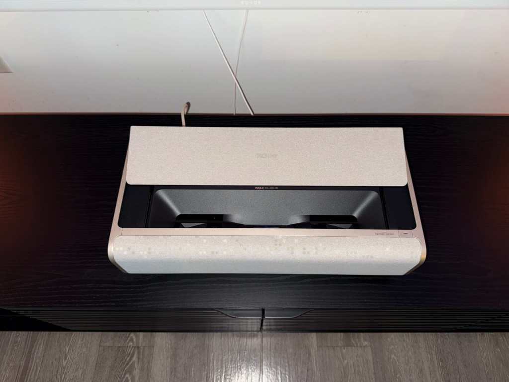 Setting up the Aura 2 was a breeze. Ultra short-throw projectors like this eliminate the need for mounting or complicated positioning. You just place it on your TV console about a foot away from the wall or screen, plug it in, and let it do its thing. The Aura 2’s adaptive technology automatically ensures the image is in focus and aligned perfectly flat to your wall or ALR screen. It’s as simple as it gets, and within minutes, you’re ready to enjoy a cinematic experience.