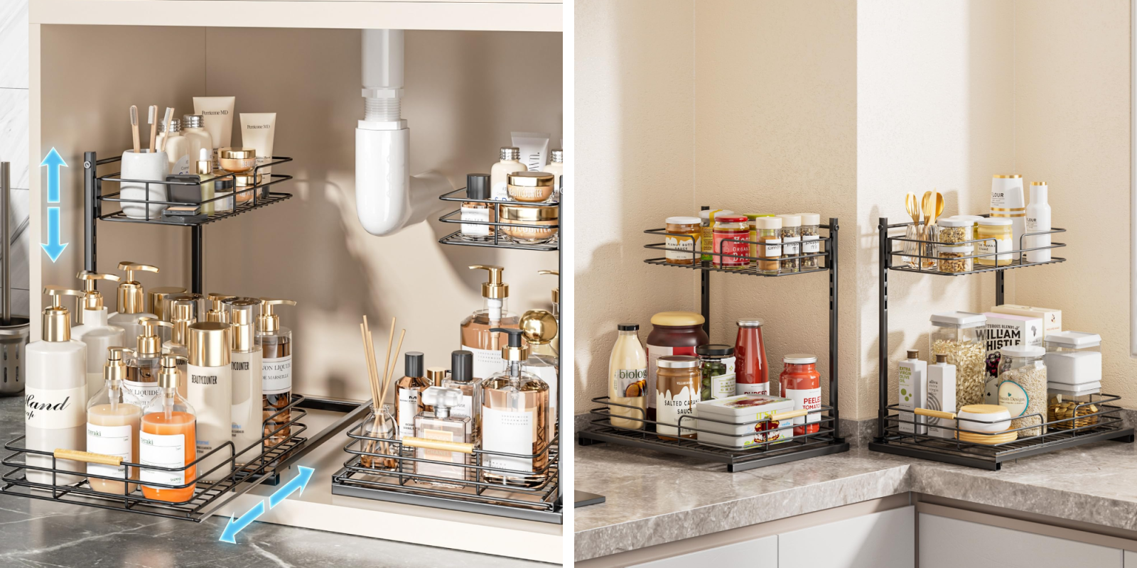 As you can see in the photo above, these organizers offer a versatile design that can be set on top of a surface, or even installed inside of a cabinet with a slide-out design. At $11.50 each, this is a small price to pay to keep things from getting disheveled around your home, if you ask me anyway.