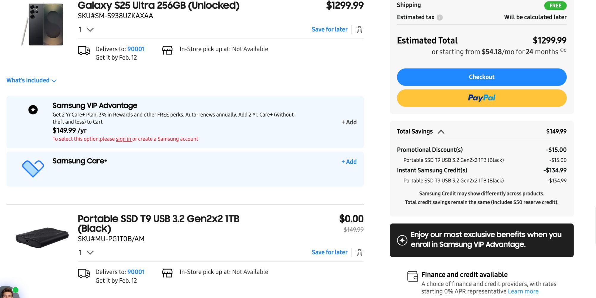 Simply follow this link and select the most affordable unlocked 256GB Galaxy S25 Ultra. Now, choose your color of choice, and then add it to the cart or head to the check out page. After that, head to SSD’s listing by following this link to select and add a 1TB T9 portable drive to your cart to go along with your Galaxy S25 Ultra pre-order. You’ll notice that the SSD has been added for FREE, meaning you can now proceed to checkout and pay for just your Galaxy S25 Ultra. Here, take a look: