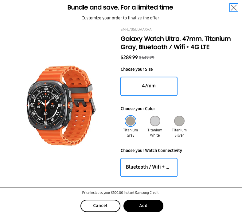 Then, before adding everything to your cart, scroll down on the S25 Ultra listing page to the “Start building healthy habits with Galaxy” section and scope out the prices on the Galaxy Watch Ultra and Galaxy Watch 7. They work out like this: