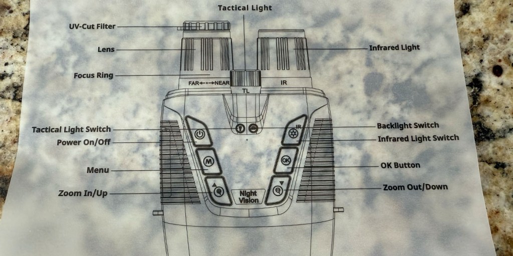 To begin, I installed the memory card and fully charged the 4K night vision binoculars. While doing so, I familiarized myself with the buttons using the handy diagram as I prepared for nightfall.